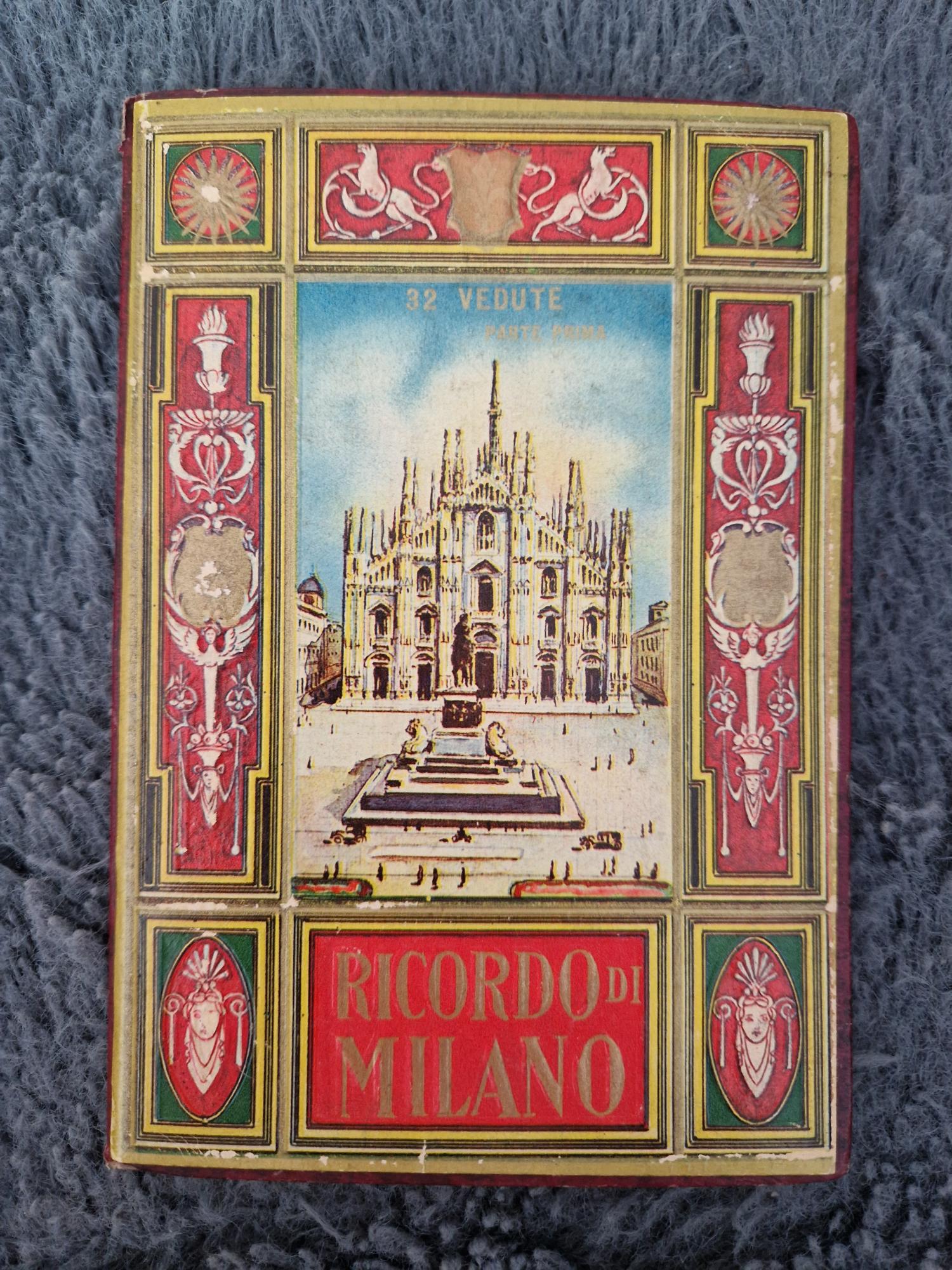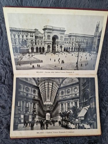 Álbum desplegable (formato acordeón) de carácter turístico que presenta 32 vistas en blanco y negro o sepia de la ciudad de Milán, con textos en italiano, inglés, francés y alemán. La cubierta ilustrada muestra el Duomo y en el interior incluye un plano de la ciudad. Tapa dura con ilustración grabada en color.