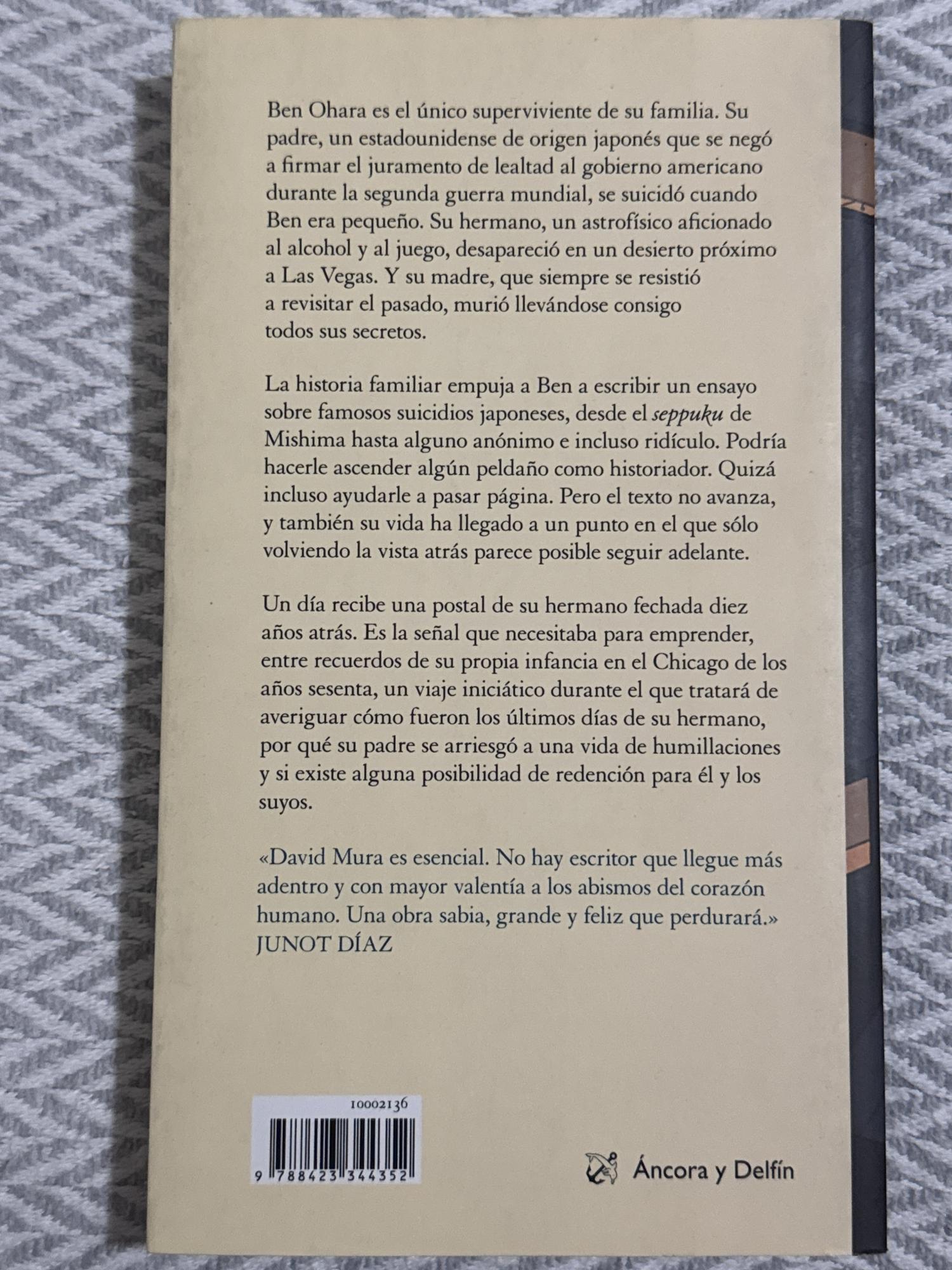 Suicidios famosos del Imperio japonés de David Mura sigue a Ben Ohara, un historiador que investiga casos de suicidio en Japón mientras recibe una postal de su hermano desaparecido que lo impulsa a emprender un viaje revelador. Su búsqueda se convierte en una indagación sobre su identidad familiar, el peso de la historia y las heridas de la memoria cultural.