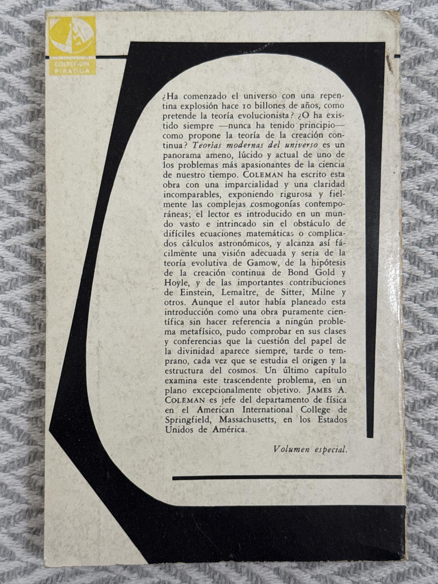 Teorías modernas del universo es un ensayo de divulgación filosófico-científica que expone y analiza las principales concepciones modernas sobre el origen, la estructura y la evolución del universo. La obra pone en diálogo la cosmología contemporánea con la reflexión filosófica, abordando las implicaciones epistemológicas y conceptuales de las teorías científicas del siglo XX.