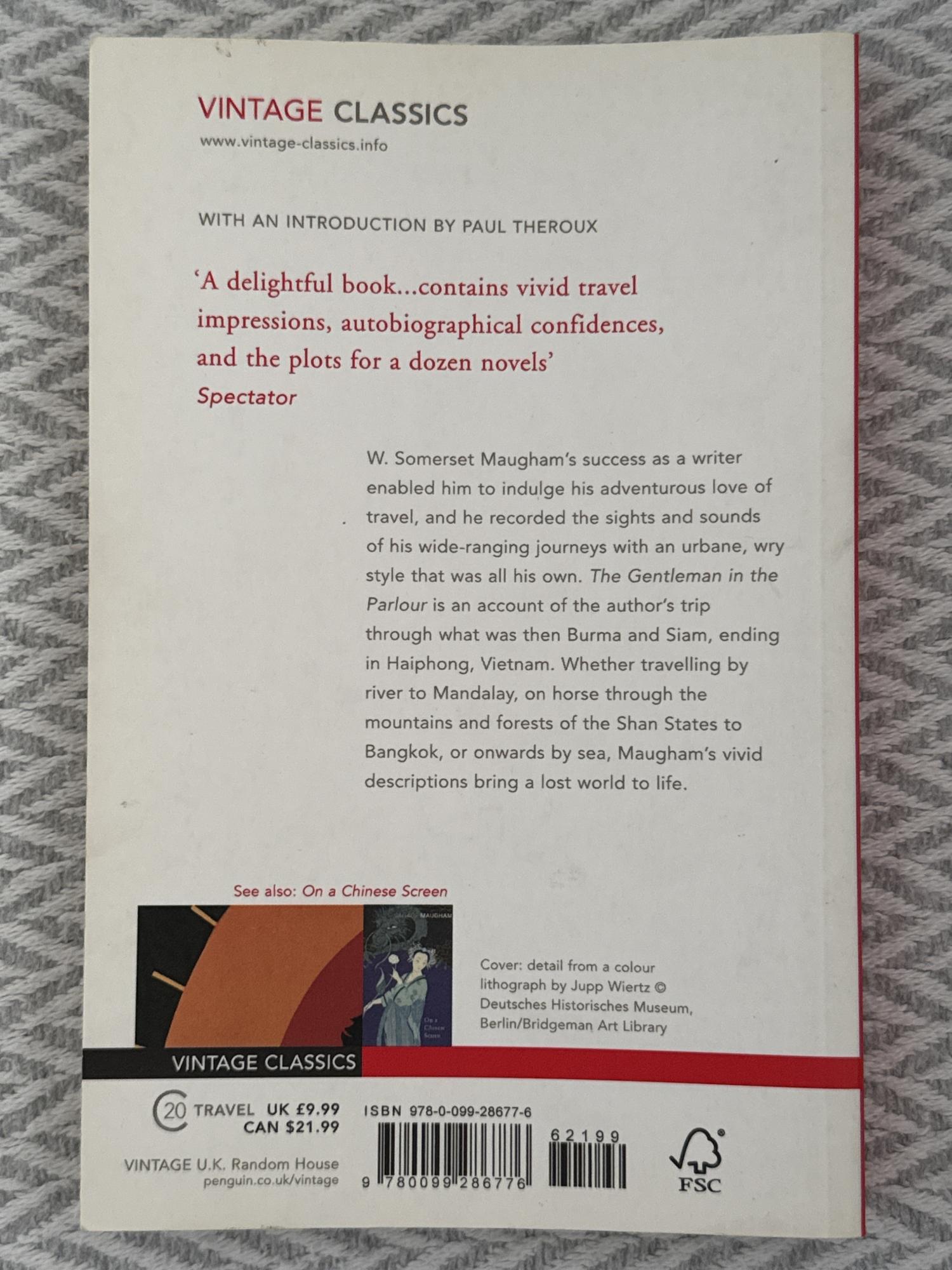 The gentleman in the Parlour de W. Somerset Maugham es un relato de viaje en el que el autor narra su recorrido por el sudeste asiático, especialmente por Birmania, Siam, Camboya y Vietnam. A través de observaciones personales y reflexiones culturales, la obra combina crónica de viaje con comentarios sobre las costumbres, la historia y la vida cotidiana de los lugares visitados.