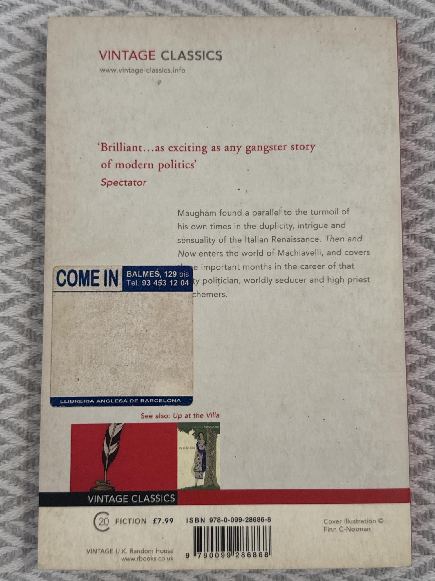Then and now de W. Somerset Maugham es una novela ambientada en la Italia del Renacimiento que recrea un episodio de la vida de Nicolás Maquiavelo. A través de intrigas políticas, diplomacia y relaciones personales, la obra reflexiona sobre el poder, la astucia y la naturaleza humana en el contexto de las luchas políticas de la época.