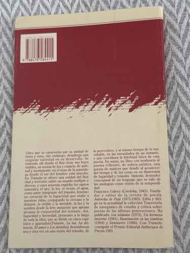 Tránsito es una colección poética que explora los momentos efímeros y sensoriales de la experiencia humana. Con apenas 91 páginas, el autor evoca atmósferas de luz cambiante, deseos imprecisos y horizontes que se desdibujan. El lenguaje transmite una sensación de movimiento constante, inestable, donde recibe protagonismo la fugacidad de lo vivido y lo invisible que rodea el instante.