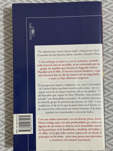 Tu rostro mañana: 1 Fiebre y lanza de Javier Marías sigue al narrador, Jacques Deza, quien tras regresar a Inglaterra para separarse de su esposa, se integra en un servicio secreto que lo entrena para interpretar los gestos y futuros actos de las personas. Mientras Deza navega entre lealtades, traiciones y memorias difusas, descubre que su “don” de prever lo que otros harán lleva implícita una carga moral y un peligro íntimo.