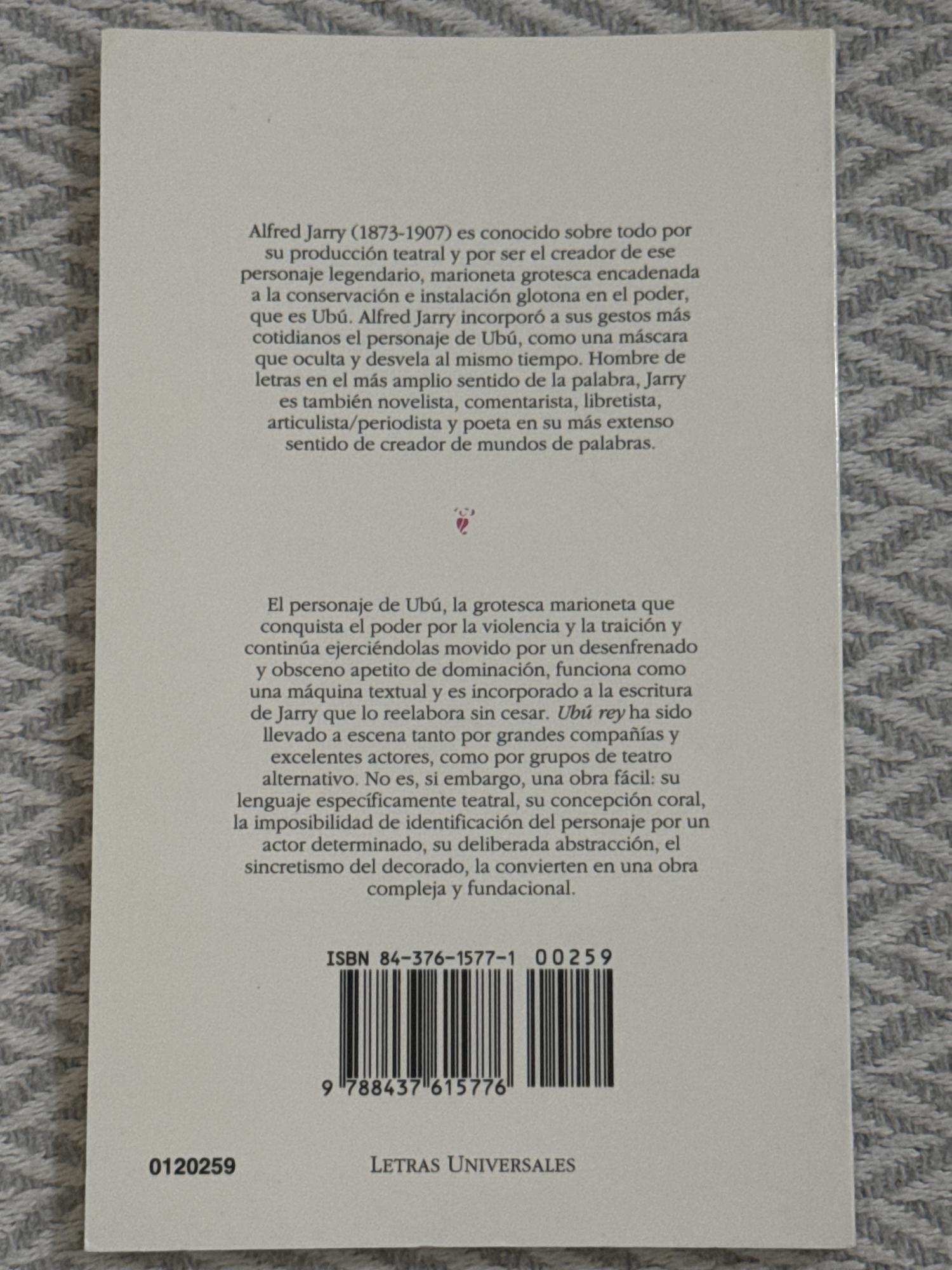 «Ubú rey» es una pieza teatral satírica y absurda que parodia la ambición desmedida, la tiranía y la corrupción del poder. Su protagonista es el grotesco personaje Père Ubu, que tras asesinar al rey de Polonia con su esposa, usurpa el poder y gobierna con arbitrariedad, crueldad y estupidez. El tono de la obra mezcla lo ridículo con lo cruel, exponiendo la fragilidad de las convenciones sociales y políticas. La exageración y el humor negro están al servicio de una denuncia de la codicia y la brutalidad que puede ocultarse bajo las apariencias del poder.