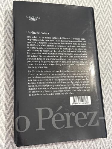 Un día de cólera de Arturo Pérez-Reverte es una novela histórica que recrea el levantamiento del 2 de mayo de 1808 en Madrid contra las tropas napoleónicas. A partir de numerosos personajes reales y anónimos, la obra reconstruye de forma coral y documentada los acontecimientos de ese día, mostrando la violencia, el heroísmo y el caos de la insurrección popular.