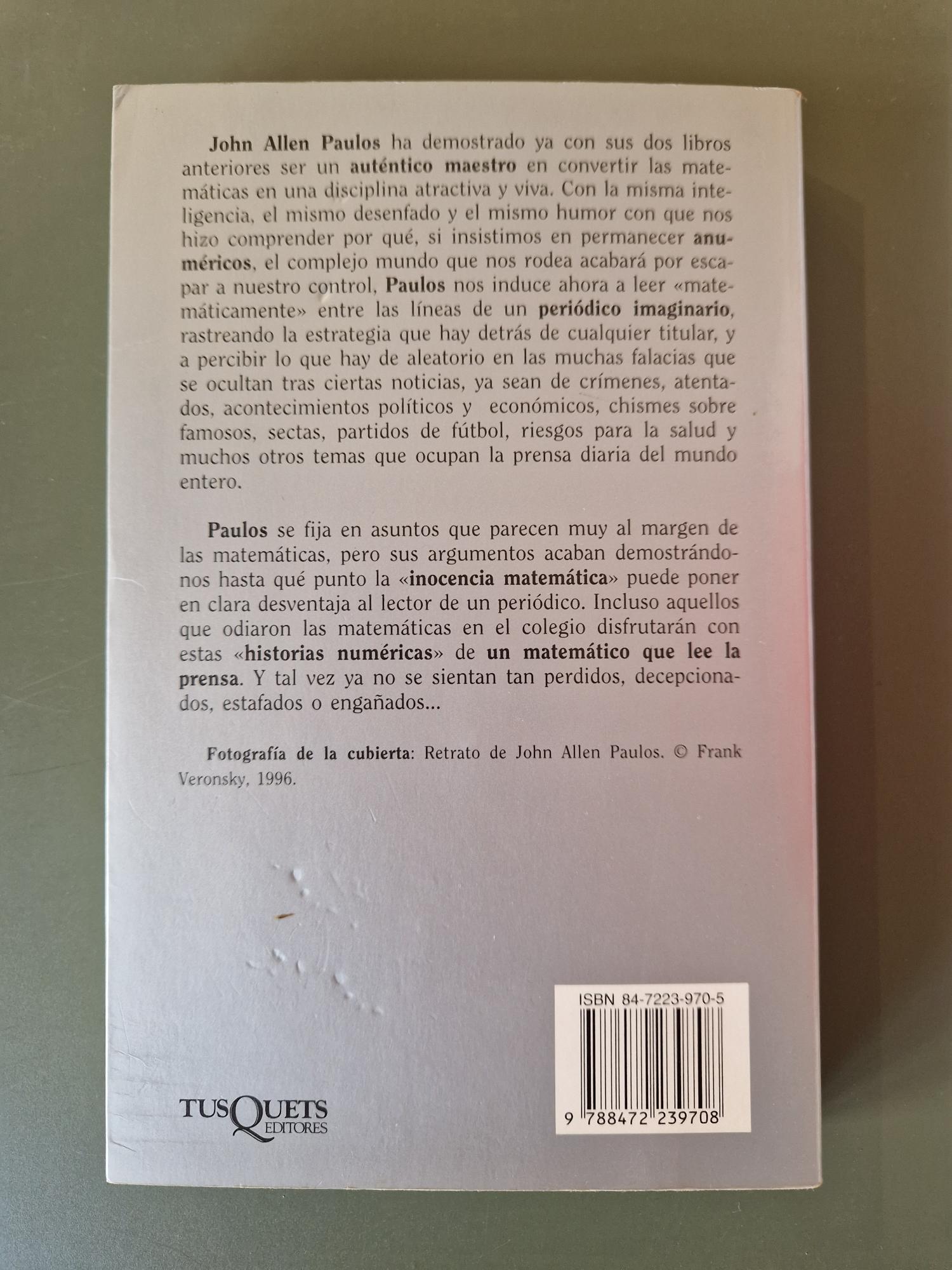 John Allen Paulos analiza cómo se utilizan —y a menudo se malinterpretan— los números en los medios de comunicación. A partir de noticias y ejemplos cotidianos, muestra errores frecuentes en estadísticas, probabilidades y razonamientos. Con claridad y sentido del humor, invita al lector a desarrollar una mirada crítica ante la información. Un libro que enseña a leer el mundo con ojos matemáticos.