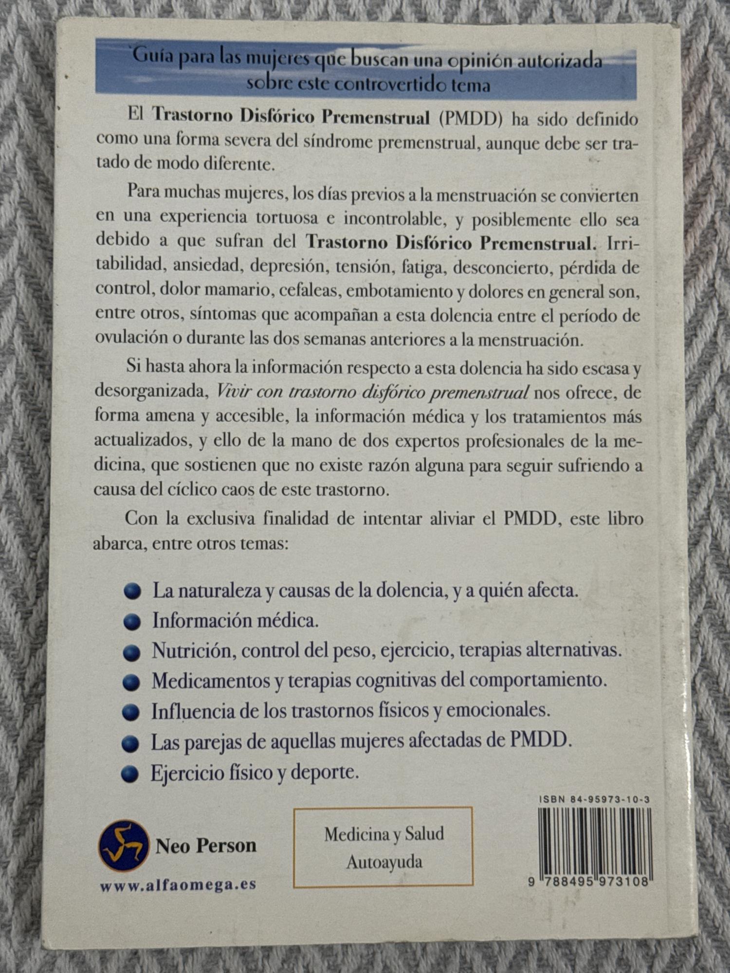 Este libro analiza el trastorno disfórico premenstrual (PMDD), una forma severa del síndrome premenstrual, describiendo sus síntomas físicos y emocionales: irritabilidad, ansiedad, depresión, fatiga, dolores, entre otros. Ofrece información médica actualizada, consejos sobre nutrición, terapias alternativas, tratamiento médico, y recomendaciones para mejorar la calidad de vida de quienes lo padecen. Es una obra orientada a mujeres, profesionales de la salud o cualquier persona interesada en comprender y manejar este trastorno de forma informada.
