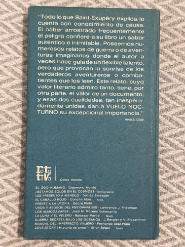 Vuelo nocturno de Antoine de Saint-Exupéry es una novela breve ambientada en los primeros años de la aviación postal en Sudamérica. A través de la historia de los pilotos que vuelan de noche transportando correo, la obra reflexiona sobre el deber, el riesgo y el sentido del trabajo humano frente a la adversidad.